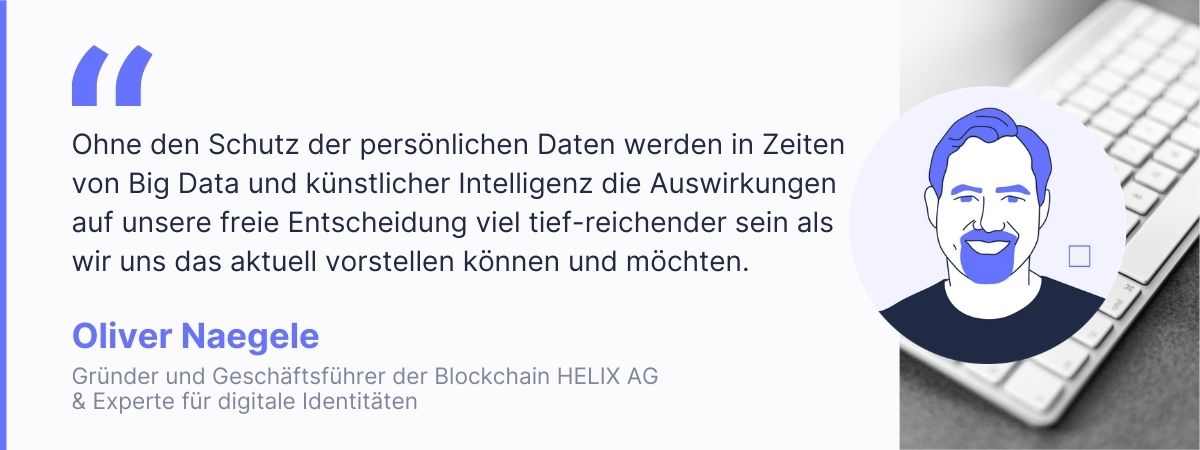Oliver Naegele ist Gründer und Geschäftsführer der Blockchain HELIX AG und Experte im Bereich Digital Identity Management und Distributed Authority. Er gründete 2016 sein Unternehmen, die Blockchain HELIX AG in Frankfurt und ist zudem Initiator des „Blockchain Frankfurt Meetup“ und des bundesweiten Finanz-Netzwerks „FinTech Headquarter“. Als Gründungsmitglied im Bundesverband für Blockchain engagiert er sich auch auf politischer Ebene für das Thema Digitalisierung und Blockchain. Der Verband vertritt die Interessen der Blockchain Branche gegenüber Politik und Gesetzgeber. Mit uns spricht er über den Schutz von persönlichen Daten.