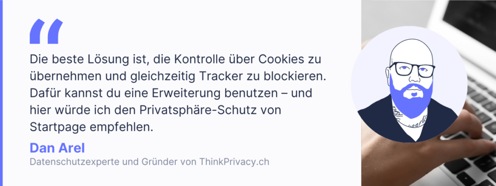 Die beste Lösung ist, die Kontrolle über Cookies zu übernehmen und gleichzeitig Tracker zu blockieren. Dafür kannst du eine Erweiterung benutzen – und hier würde ich den Privatsphäre-Schutz von Startpage empfehlen. Mit dieser Browser-Erweiterung erhältst du einen detaillierten Überblick darüber, welche Tracker und Cookies im Hintergrund laufen und kannst ganz einfach entscheiden, welche du blockieren und welche du erlauben möchtest.
