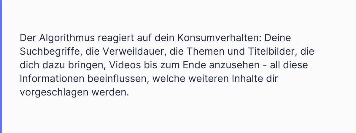 Die Videoplattform ist so beliebt, weil hier Informationen und Inhalte leicht zugänglich und gleichzeitig unterhaltsam aufbereitet werden. Außerdem werden den Nutzer*innen weitere relevante Inhalte vorgeschlagen. Dafür sorgt der Algorithmus des Empfehlungssystems und der funktioniert so: Du suchst nach ein paar Rückenübungen, um deinen Rücken im Home Office zu entlasten. Sofort werden dir weitere Videos mit verschiedenen Übungen vorgeschlagen, die gegen Verkrampfungen und Schmerzen helfen sollen. Je mehr Videos du schaust, umso mehr Hinweise gibst du dem Algorithmus, welche Inhalte er dir vorschlagen soll.