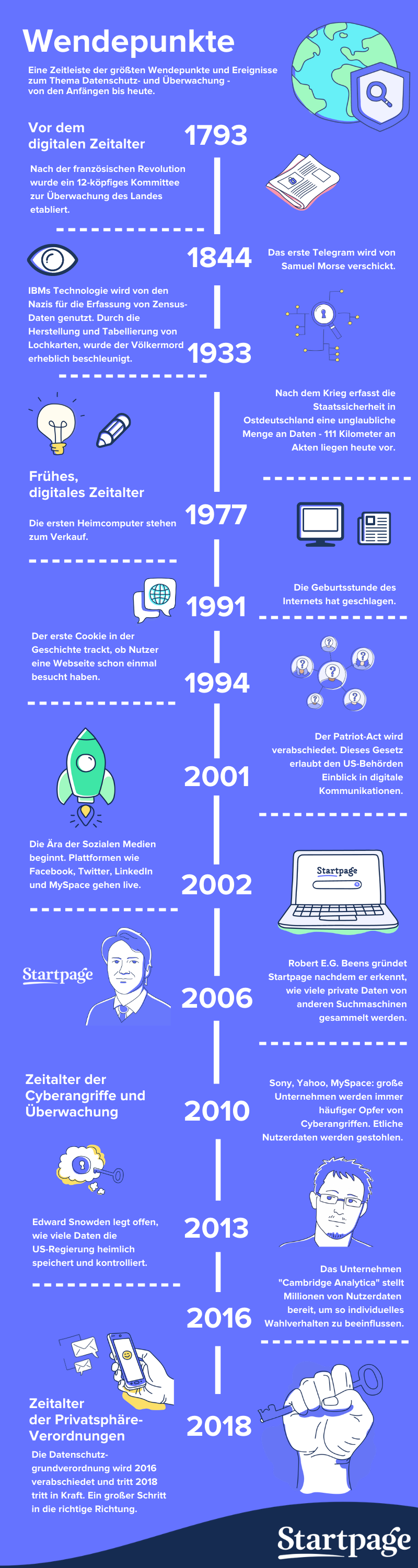 Am 28. Januar ist der Internationale Datenschutztag. Wir möchten diese Gelegenheit nutzen, um einen Blick auf die Geschichte des Datenschutzes zu werfen. Dafür haben wir eine Übersicht der historisch signifikanten Ereignisse im Datenschutz und Privatsphäre für euch zusammengestellt. Unsere Infografik findet ihr weiter unten in diesem Beitrag. Auf einige der gelisteten Wendepunkte werden wir im Laufe des Monats noch ausführlicher eingehen. Könnt ihr euren persönlichen Datenschutz-Wendepunkt auf unserer Infografik finden?