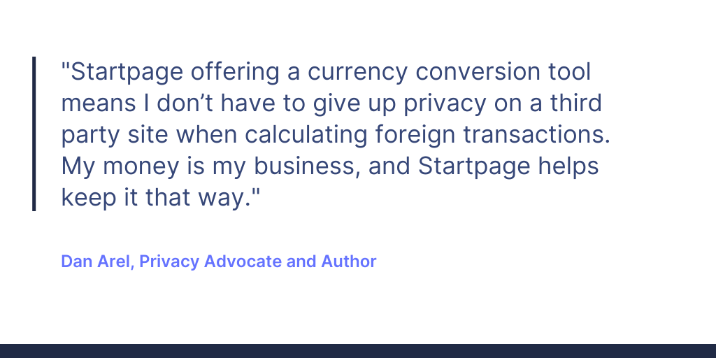 “Startpage offering a currency conversion tool means I don’t have to give up privacy on a third party site when calculating foreign transactions. My money is my business, and Startpage helps keep it that way.”