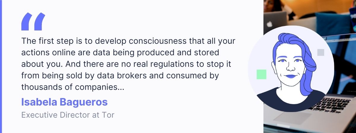 Isabela Bagueros: The first step is to develop consciousness that all your actions online are data being produced and stored about you. And there are no real regulations to stop it from being sold by data brokers and consumed by thousands of companies that have some business that makes money out of this information. First step is to care about what will happen with that information you are typing, the link you clicked, your actions when you are online.