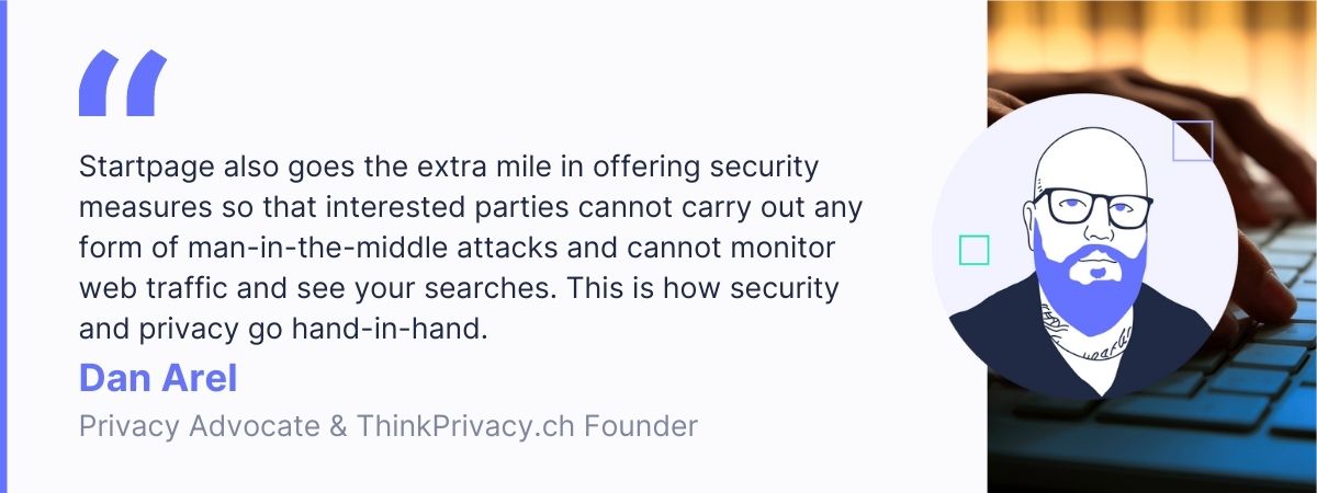 Startpage offers you privacy when you search by anonymizing your searches, not logging your search history, not tracking your IP address or browser/system information. Meaning that your searches are completely private and unidentifiable to anyone. Startpage also goes the extra mile in offering security measures so that interested parties cannot carry out any form of man-in-the-middle attacks and cannot monitor web traffic and see your searches. This is how security and privacy go hand-in-hand. They are not simply one in the same, but instead two separate features that when combined offer users the safest internet experience.