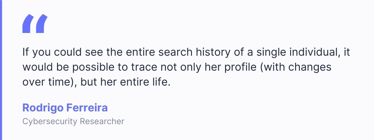 I have a friend who had his cell phone stolen once. (This is very common around here, almost certainly depending on the time you leave home). From the search history, the criminals may have discovered that he had searched for a band show he liked in the region. On the appointed day, he was robbed again and my paranoia insists that it was the same guys. This is what can take a simple search history, in the hands of any assailant. A grain of sand in all this data collected by the biggest names in the tech industry.