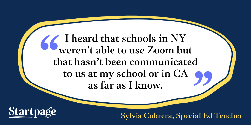 As of now, the privacy and security flaws in tools educators and students are expected to use have not been completely addressed. Almost two months since she left her classroom, Sylvia said, “I heard that schools in NY weren’t able to use Zoom but that hasn’t been communicated to us at my school or in CA as far as I know. We were not given any additional tools that protect ours and our students’ privacy.”