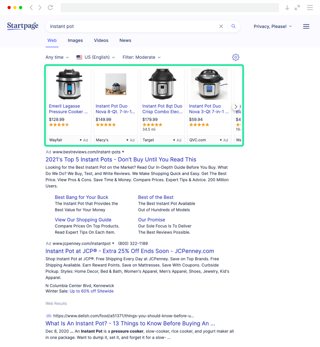 Startpage is committed to continuously making a better search experience for our users. Over the past several months, many of our users have reached out to request a fair, un-personalized, anonymous way to receive product recommendations that they are searching for. Our team is delighted to make this a reality for you by updating how we deliver ads, now offering direct ways to buy.
