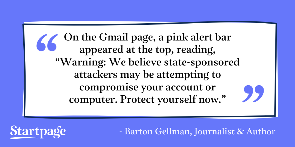 “On the Gmail page, a pink alert bar appeared at the top, reading, “Warning: We believe state-sponsored attackers may be attempting to compromise your account or computer. Protect yourself now.”