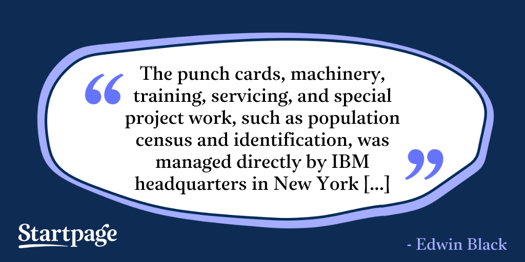 “The punch cards, machinery, training, servicing, and special project work, such as population census and identification, was managed directly by IBM headquarters in New York, and later through its subsidiaries in Germany, […] , Poland, Holland, France, Switzerland, and other European countries.”